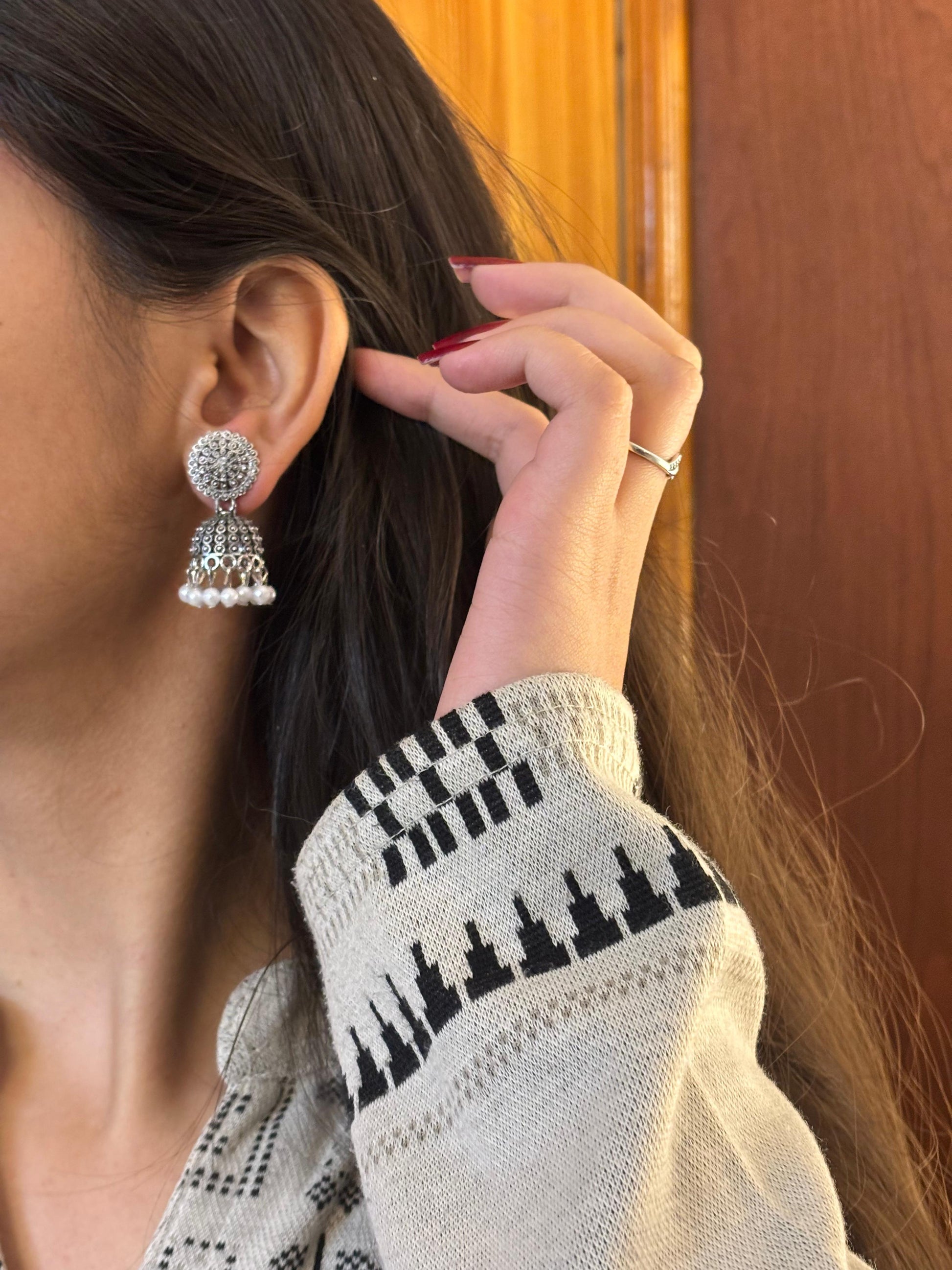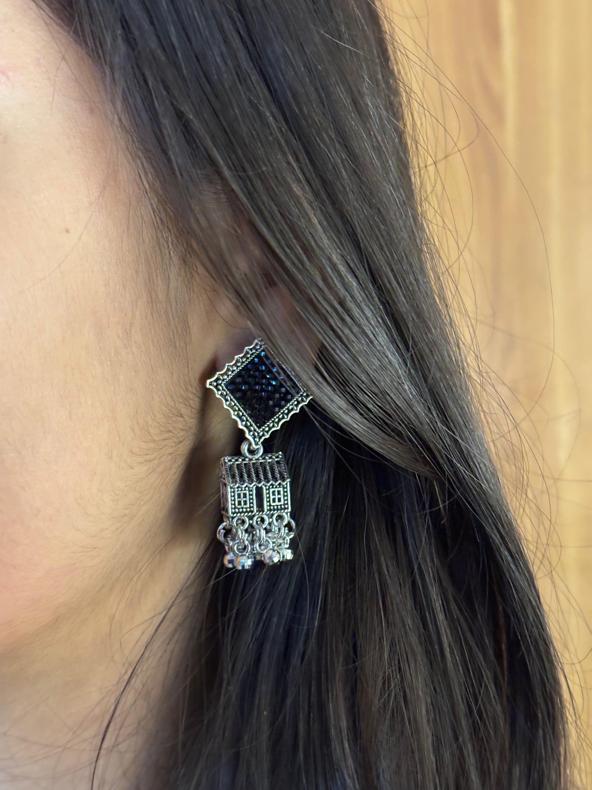 - Silver square & chain jhumka earrings β Square oxidised stud paired with chain-linked mini jhumkas for a layered look.